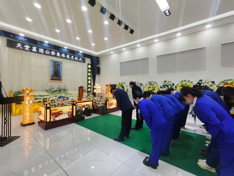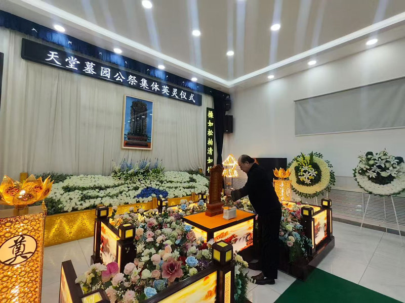 在天堂墓园礼仪告别厅内为所有逝者举行烧香献花公祭仪式。
